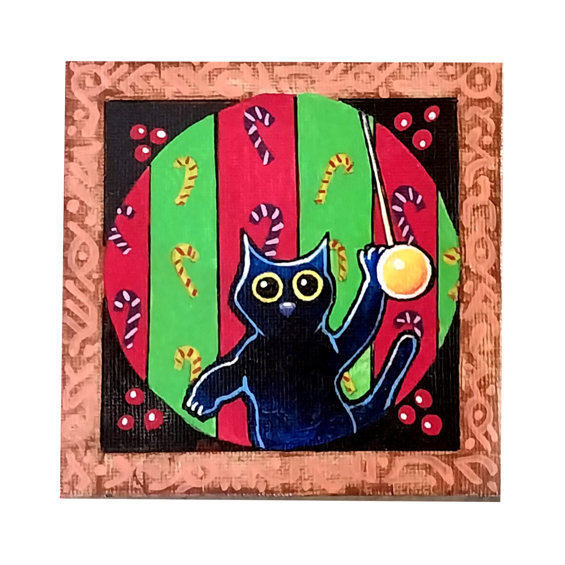 Black Cat Christmas - original folk art - 4" x 4" acrylic, framed